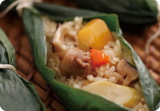 (4)笹の葉で(3)と栗を包んでたこ糸でしばってから、さらにラップをかぶせる。